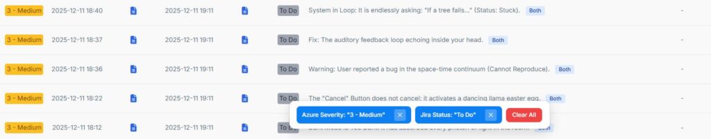 Visualize and align critical fields across platforms. Ensure the Azure Status and Jira Status, as well as Azure and Jira Severities, match perfectly to prevent misinterpretations between QA and Dev teams.