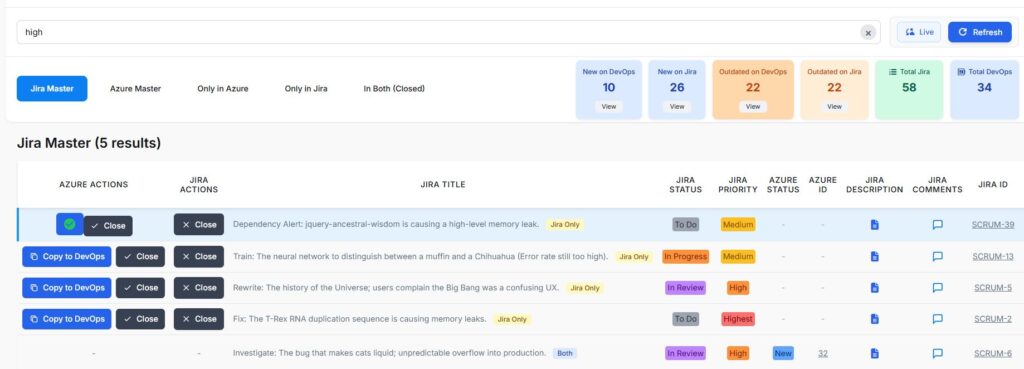 Utilize global search functionality across all Jira and Azure DevOps fields to pinpoint specific tickets, even across custom fields.